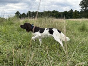 Brush Dale’s Zealous Hunter “Covey” is a female small munsterlander whelped 5/5/24. Covey is proving to be a phenomenal dog in the field. She hunts with tremendous energy and has been pointing planted pigeons as far a twenty yards back. She swims with enthusiasm, often charging and “dock diving” into the water after a bumper or bird. Covey also tracks well and has successfully completed several short dead game drags in the yard. She’s also shown to naturally honor on a few occasions.